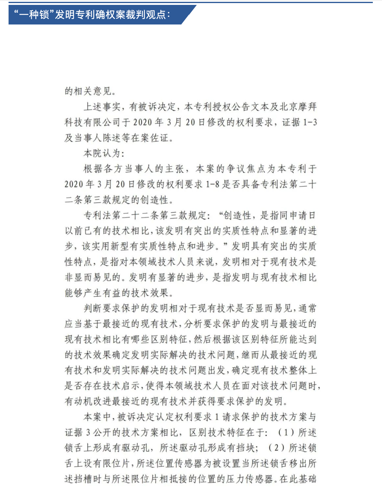 近日,北京知識產(chǎn)權(quán)法院發(fā)布了《專利確權(quán)授權(quán)審判案析2014-2024》,從其十年間審結(jié)的逾一萬件專利確權(quán)授權(quán)案件中,精選了58件具有指導意義的案例,并提煉出20條案析規(guī)則,為業(yè)界提供明確的司法指引。三聚陽光代理的“一種鎖”發(fā)明專利確權(quán)案因其典型性入選,為專利創(chuàng)造性的判斷提供了有力示范。