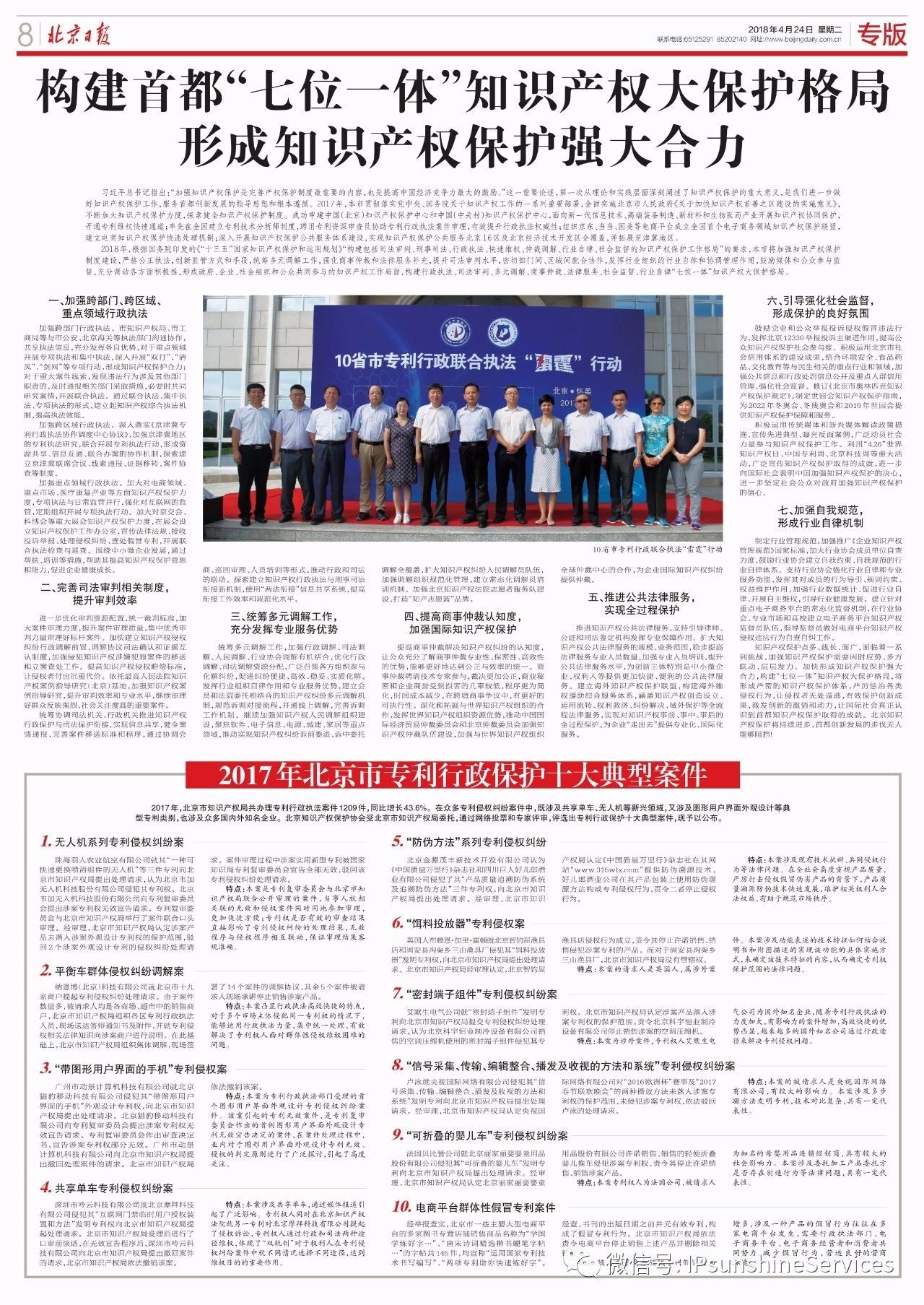 日前,北京知識產(chǎn)權(quán)保護協(xié)會受北京市知識產(chǎn)權(quán)局委托,舉辦“北京市2017年專利行政保護十大典型案件”評選。經(jīng)過社會公眾的網(wǎng)絡投票,以及審議、公示后,由三聚陽光代理的“中國質(zhì)量萬里行‘防偽方法’系列專利侵權(quán)糾紛案”、“摩拜單車專利侵權(quán)糾紛案”入選。4月24日出版的北京日報專版予以報道。