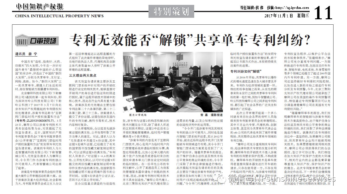 9月27日,專利復審委員會組織對該案進行公開審理。該案是專利復審委員會組織開展重大案件公開審理活動的第六案。由于該無效宣告請求案主要涉及互聯(lián)網(wǎng)門禁系統(tǒng)中針對用戶的開鎖權(quán)限進行設定的相關技術(shù),能夠直接對開鎖用戶的身份進行驗證和權(quán)限進行授權(quán),屬于遠程開鎖技術(shù)領域中的核心技術(shù),因此在行業(yè)內(nèi)具有重大影響,涉及重大經(jīng)濟利益,社會影響力大,專利復審委員會成立五人合議組對其進行審理,合議組成員由相關技術(shù)領域?qū)彶闃I(yè)務專家及法律專家擔任。三聚陽光張建綱、周美華、吳黎三位律師出庭參審。近100人現(xiàn)場旁聽了該案審理?!吨袊R產(chǎn)權(quán)報》11月1日刊發(fā)題為《專利無效能否“解鎖”共享單車專利糾紛?》的文章,專題報道了該案。