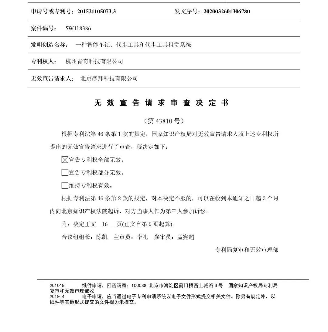 3月31日,由三聚陽光代理的北京摩拜科技有限公司與杭州青奇科技有限公司(青桔單車)的一場專利無效宣告案勝利結案。在國家知識產權局作出的第43810號無效審查決定中,專利權人青奇科技擁有的專利號為201521105073.3 的”一種智能車鎖、代步工具和代步工具租賃系統(tǒng)“專利,專利權被宣告全部無效。此案中,三聚陽光代理方為請求人摩拜公司。
