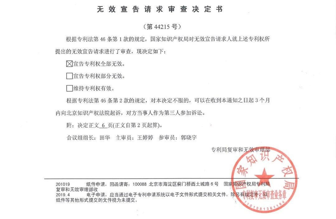 2020年4月24日,國(guó)家知識(shí)產(chǎn)權(quán)局專(zhuān)利復(fù)審委員會(huì)就專(zhuān)利號(hào)為201820458813.9,名稱(chēng)為“受話器及電子設(shè)備”,由三聚陽(yáng)光及旗下易聚律所代理無(wú)效宣告請(qǐng)求人的專(zhuān)利無(wú)效宣告案作出當(dāng)庭宣告,宣告該專(zhuān)利專(zhuān)利權(quán)全部無(wú)效。