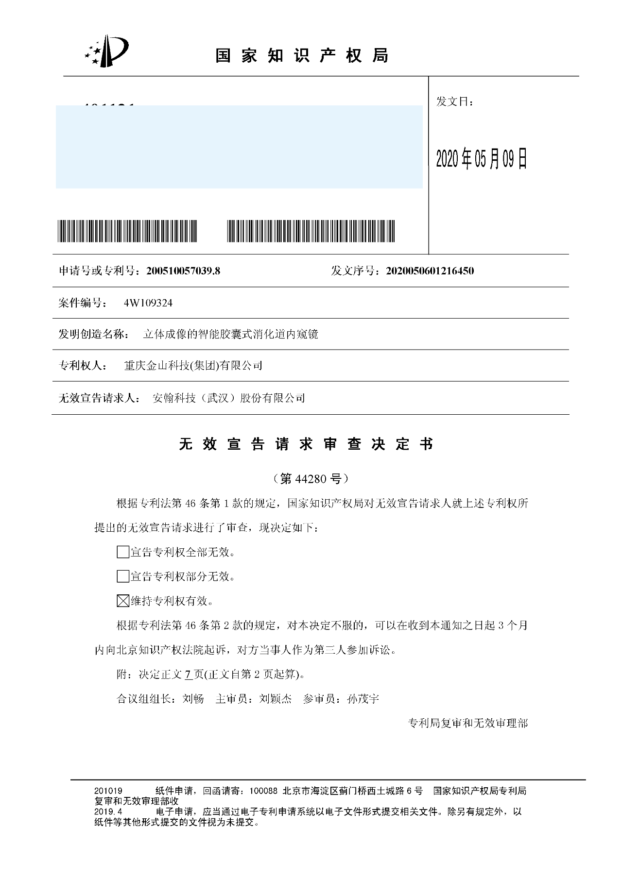 近日,三聚陽(yáng)光及旗下易聚律所代理的專(zhuān)利權(quán)人重慶金山與安翰科技的一起發(fā)明專(zhuān)利無(wú)效宣告案勝利結(jié)案。國(guó)家知識(shí)產(chǎn)權(quán)局作出第 44280 號(hào)審查決定,維持重慶金山專(zhuān)利號(hào)為“200510057039.8”、名稱(chēng)為“立體成像的智能膠囊式消化道內(nèi)窺鏡”的發(fā)明專(zhuān)利專(zhuān)利權(quán)全部有效。