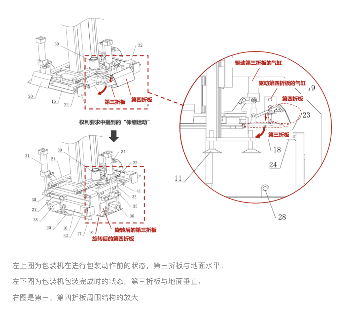 請注意動圖及結(jié)構(gòu)圖中,第四折板的運動方式是“旋轉(zhuǎn)+平移”,即專利權(quán)利要求1中提到的用語“伸縮運動”。觀點列舉