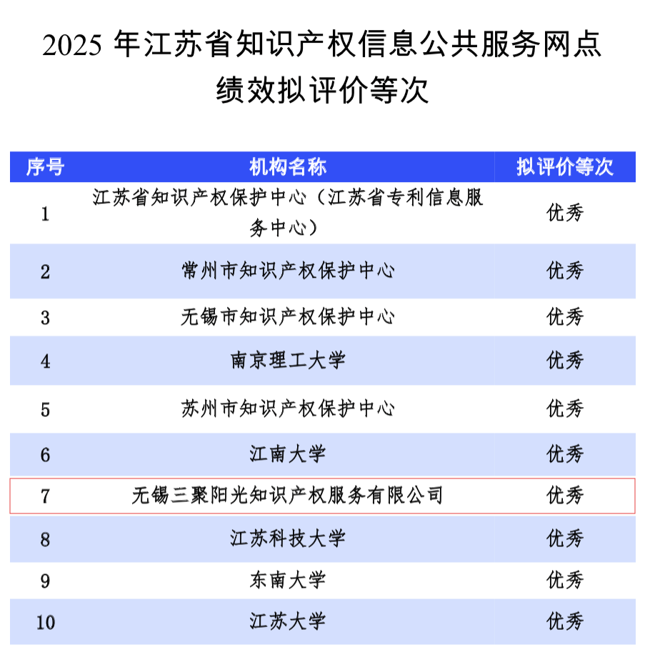近日,江蘇省知識產(chǎn)權(quán)局發(fā)布《2025年江蘇省知識產(chǎn)權(quán)信息公共服務(wù)網(wǎng)點(diǎn)績效評價(jià)結(jié)果公示》,無錫三聚陽光知識產(chǎn)權(quán)服務(wù)有限公司在本年度績效評價(jià)中獲評為“優(yōu)秀”等次。這是繼2024年度獲評“優(yōu)秀”等次之后,無錫三聚陽光再次在江蘇全省績效評價(jià)中名列優(yōu)秀行列,顯示出公司在知識產(chǎn)權(quán)信息公共服務(wù)領(lǐng)域持續(xù)穩(wěn)定的服務(wù)能力與專業(yè)水準(zhǔn)。