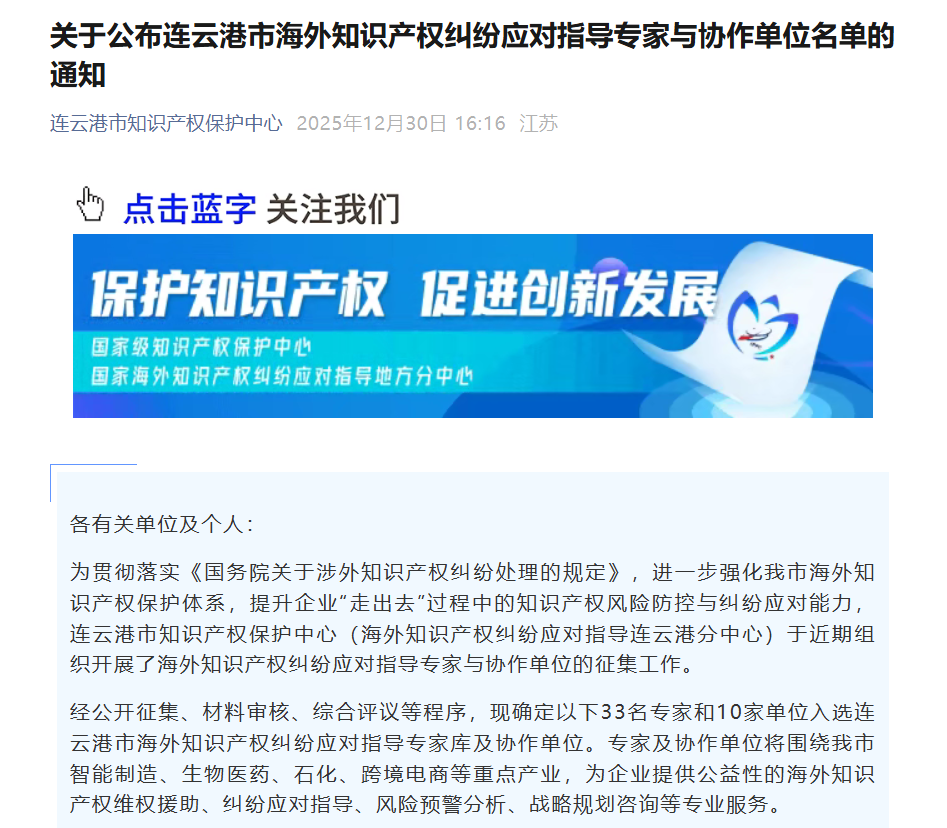 據(jù)規(guī)定,協(xié)作單位與入選專家將圍繞智能制造、生物醫(yī)藥、石化、跨境電商等重點產(chǎn)業(yè),提供公益性海外知識產(chǎn)權維權援助、糾紛應對指導、風險預警分析、戰(zhàn)略規(guī)劃咨詢等專業(yè)服務,并在后續(xù)工作中進一步深化“專家領銜、機構協(xié)同、精準服務”的海外知識產(chǎn)權糾紛應對指導體系建設,服務高水平對外開放與“一帶一路”相關支點城市建設。