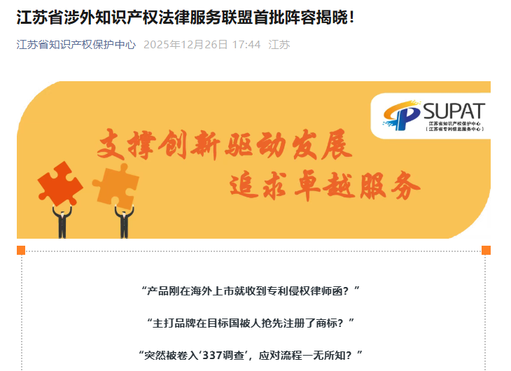 加入聯(lián)盟后,三聚陽光將依托自身在專利、商標(biāo)、版權(quán)及訴訟維權(quán)、研究咨詢等方面的綜合服務(wù)能力,積極參與聯(lián)盟服務(wù)供給與能力建設(shè),協(xié)同各成員單位共同為江蘇企業(yè)出海提供更可復(fù)制、可落地的風(fēng)險管理與糾紛應(yīng)對支持。