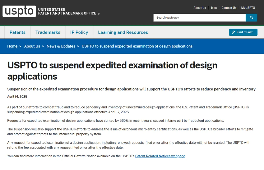 美國專利商標(biāo)局(USPTO)今天投下發(fā)布消息,宣布將從2025年4月17日起,暫停受理新的外觀設(shè)計專利加速審查請求,該程序因其速度常被業(yè)界稱為“火箭通道”(Rocket Docket)。USPTO表示,此舉旨在打擊日益增多的欺詐性申請,并努力降低整體專利申請的審查積壓時間。然而,這一決定對那些一直合規(guī)使用該程序的、尋求快速保護(hù)的正當(dāng)申請人造成了直接沖擊。